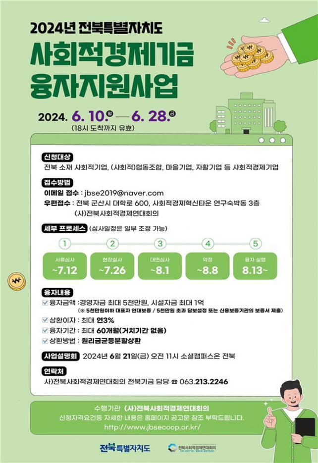 ¿ÃÇØ´Â °í±Ý¸®·Î °íÅë¹Þ°í ÀÖ´Â µµ³» »çȸÀû±â¾÷µéÀÇ ÀڱݳÀ» ±Øº¹ÇϰíÀÚ Áö¿ø±Ô¸ð¸¦ Áö³ÇØ(¾à 5¾ï¿ø) ´ëºñ 3¹è ÀÌ»ó È®´ëÇß´Ù. ±â¾÷´ç °æ¿µÀÚ±ÝÀº ÃÖ´ë 5õ¸¸¿ø±îÁö, ½Ã¼³ÀÚ±ÝÀº ÃÖ´ë 1¾ï¿ø±îÁö ½ÅûÀÌ °¡´ÉÇϸç, ¿¬ ±Ý¸® 3% À̳» Á¶°ÇÀ¸·Î ÃÖ´ë 5³â°£ À¶ÀÚÁö¿øÀ» ¹ÞÀ» ¼ö ÀÖ´Ù. ±â±ÝÀ¶ÀÚ ½ÅûÀº ¿À´Â 28ÀϱîÁö µµ ±â±Ý Áß°³±â°üÀÎ (»ç)ÀüºÏ»çȸÀû°æÁ¦¿¬´ëȸÀÇ¿¡ ¿ìÆí ¹× À̸ÞÀÏÀ» ÅëÇØ °¡´ÉÇÏ´Ù.