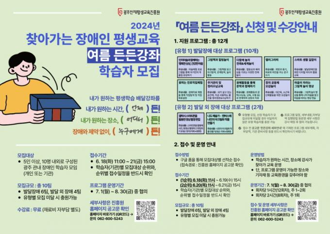 [È£³²´º½º¶óÀÎ = ¼ÀºÈ« ±âÀÚ] (Àç)±¤ÁÖÀÎÀçÆò»ý±³À°ÁøÈï¿ø(¿øÀå ÀÌÃá¹®, ÀÌÇÏ ¡®ÁøÈï¿ø¡¯)ÀÌ ¡®2024³â ¿©¸§ µçµç°Á¡¯¿¡ Âü¿©ÇÒ Àå¾ÖÀÎ ÇнÀÀÚ¿Í ±â°üÀ» ¸ðÁýÇÑ´Ù.