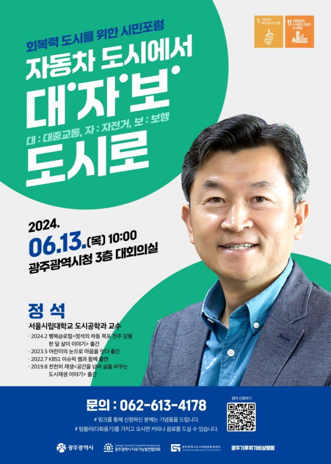 ±¤ÁÖ±¤¿ª½Ã(½ÃÀå °±âÁ¤)´Â ¿À´Â 13ÀÏ ¿ÀÀü 10½Ã ½Ãû ´ëȸÀǽǿ¡¼ µµ½ÃÀç»ý¡¤µµ½Ã¼³°è ¼®ÇÐ Á¤¼® ±³¼ö(¼¿ï½Ã¸³´ë µµ½Ã°øÇаú)¸¦ ÃʺùÇØ ¡®È¸º¹·Â µµ½Ã¸¦ À§ÇÑ ½Ã¹ÎÆ÷·³ ÀÚµ¿Â÷ µµ½Ã¿¡¼ ´ë¡¤ÀÚ¡¤º¸(´ëÁß±³Å롤ÀÚÀü°Å¡¤º¸Çà) µµ½Ã·Î¡¯¸¦ ÁÖÁ¦·Î Ưº°°¿¬À» °³ÃÖÇÑ´Ù.