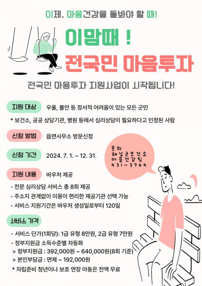 ÇØ³²±º °ü°èÀڴ¡°7¿ùºÎÅÍ ½ÃÀ۵Ǵ Àü±¹¹Î ¸¶À½ÅõÀÚ Áö¿ø»ç¾÷ÀÌ ¾ÈÁ¤ÀûÀ¸·Î ÃßÁøµÉ ¼ö ÀÖµµ·Ï ÃÖ¼±À» ´ÙÇϰڴ١±¸é¼¡°±º¹ÎÀÇ Á¤½Å °Ç° µ¹º½ Áö¿øÀ» ÅëÇØ ¸¶À½µµ °Ç°Çϰí ÇູÇÑ ÇØ³²À» ¸¸µé¾î ³ª°¡°Ú´Ù.¡±°í ÀüÇß´Ù.