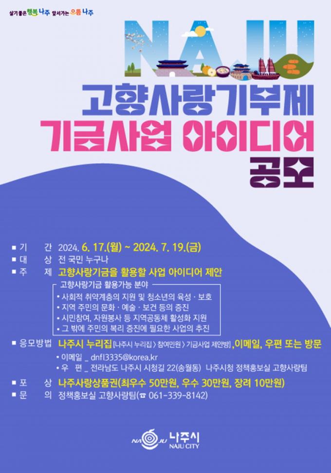 °ø¸ð´Â ³ªÁÖ°íÇâ»ç¶û±âºÎÁ¦¿¡ ¾ÖÁ¤°ú °ü½ÉÀ» °¡Áø ±¹¹Î ´©±¸³ª Âü¿©ÇÒ ¼ö ÀÖ´Ù. ¿À´Â 7¿ù 19ÀϱîÁö ½Ãû ´©¸®Áý, À̸ÞÀÏ, ¿ìÆí¡¤¹æ¹®(½Ãû Á¤Ã¥È«º¸½Ç °íÇâ»ç¶ûÆÀ) µîÀ¸·Î Âü¿©ÇÏ¸é µÈ´Ù. ¼·ù ¹× ÀÚ¼¼ÇÑ »çÇ×Àº ½Ãû ´©¸®Áý¿¡¼ È®ÀÎÇÏ¸é µÈ´Ù.