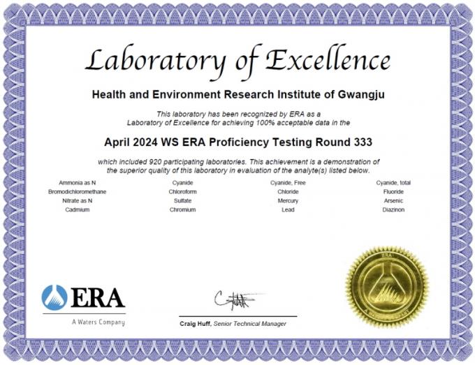 ¼÷·Ãµµ ½ÃÇèÀº ¸Ô´Â¹° ºÐ¾ß ½ÃÇ衤°Ë»ç±â°üÀÇ ºÐ¼®´É·Â °ËÁõ ¹× °Ë»ç°á°úÀÇ Á¤È®¼º‧½Å·Ú¼º È®º¸¸¦ À§ÇØ ½Ç½ÃÇÏ´Â °ÍÀ¸·Î, ±¤ÁÖº¸°Çȯ°æ¿¬±¸¿øÀº ±¹Á¦¼÷·Ãµµ ½ÃÇèÆò°¡±â°ü Áß ÇÑ °÷ÀÎ ¹Ì±¹ ȯ°æÀÚ¿øÇÐȸ(ERA)¿¡¼ ½Ç½ÃÇÏ´Â ½ÃÇè¿¡ Âü°¡Çß´Ù.