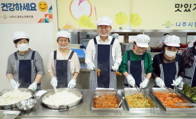 À± ½ÃÀåÀº ¿ÀÀü ¸¶Áö¸· ÀÏÁ¤À¸·Î ³ªÁÖ½ÃÁߺγëÀκ¹Áö°ü¿¡¼ ¾î¸£½Å 300¿©¸íÀ» ´ë»óÀ¸·Î ¹è½Ä ºÀ»ç¿¡ Âü¿©ÇÑ ÈÄ ¿øµµ½É û³â â¾÷¿¡ ¼º°øÇÑ ½Ä´ç(û»ê¿Á)¿¡¼ û³â »ç¾÷°¡, »óÀÎȸ °ü°èÀÚ¿Í ¿ÀÂùÀ» ÅëÇØ »ó±Ç Ȱ¼ºÈ ¹æ¾ÈÀ» ³íÀÇÇß´Ù.