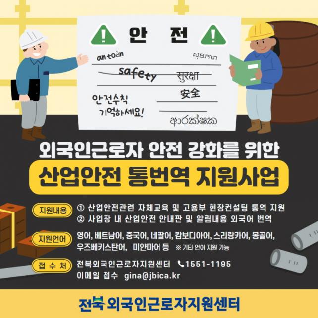¿Ü±¹ÀÎ ±Ù·ÎÀÚ ÇöÀå ÄÁ¼³ÆÃ ¹× »ê¾÷¾ÈÀü¿¡ ´ëÇÑ Åë¹ø¿ª Áö¿ø µîÀº ÀüºÏ¿Ü±¹ÀαٷÎÀÚÁö¿ø¼¾ÅÍ(¢Î1551-1195)¸¦ ÅëÇØ Á¢¼ö °¡´ÉÇÏ´Ù.