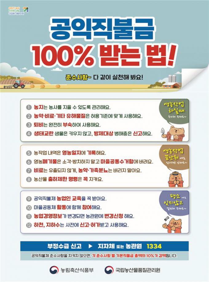 2020³â¿¡ µµÀÔµÈ °øÀÍÁ÷ºÒÁ¦´Â ³ó¾÷․³óÃÌÀÇ °øÀÍÀû ±â´ÉÀ» ÁõÁøÇÏ¸é¼ ³ó¾÷¿¡ Á¾»çÇÏ´Â ³ó¾÷ÀÎÀÇ ¼Òµæ¾ÈÁ¤À» µ½±â À§ÇØ Á÷ºÒ±ÝÀ» Áö¿øÇÏ´Â Á¦µµ´Ù. Á÷ºÒ±ÝÀ» 100% ¹Þ±â À§Çؼ´Â ³ó°¡°¡ ¹ý·É¿¡¼ Á¤ÇÑ 17°¡Áö Àǹ« Áؼö»çÇ×À» ¸ðµÎ ½ÇÃµÇØ¾ß ÇÑ´Ù.