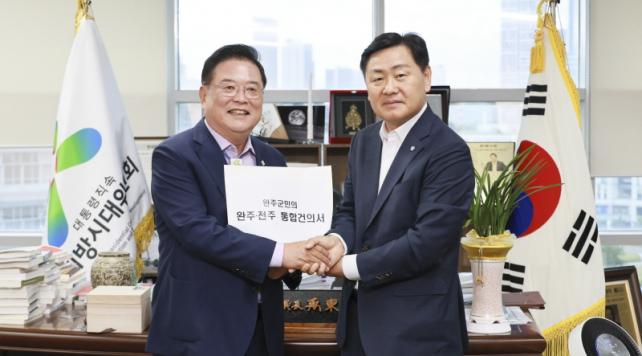 ÇÑÆí, Áö³ 22ÀÏ ±è Áö»ç´Â ¿ÏÁÖ±º¹ÎÀÌ Á¦ÃâÇÑ ¡°¿ÏÁÖ¡¤ÀüÁÖ ÅëÇÕ°ÇÀǼ¡±¸¦ Á¤ºÎ¿¡ Á¦ÃâÇϱ⿡ ¾Õ¼ ¿¸° ±âÀÚȸ°ß¿¡¼ ÀüÁÖ‧¿ÏÁÖ ÅëÇսø¦ ¡°Æ¯·Ê½Ã¡±·Î ÁöÁ¤ÇÏ¿© ´õ ¸¹Àº ÀÚÀ²¼º°ú ´Ù¾çÇÑ ¹ßÀü ±âȸ¸¦ Á¦°ø, ±¤¿ª½Ã¿¡ ¹ö±Ý°¡´Â ÀüºÏÀÇ ÁßÃßµµ½Ã·Î À°¼ºÇϰڴٴ ÀÔÀåÀ» ¹àÈù ¹Ù ÀÖ´Ù.