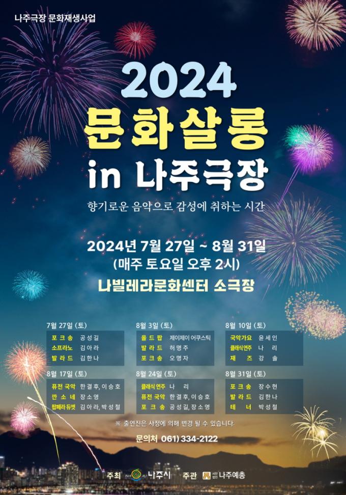 ³ªÁÖ½Ã(½ÃÀå À±º´ÅÂ)´Â ¿À´Â 27ÀϺÎÅÍ 8¿ù 31ÀϱîÁö ¸ÅÁÖ Åä¿äÀÏ ¿ÀÈÄ 2½Ã ³ªÁÖ³ªºô·¹¶ó¹®È¼¾ÅÍ¿¡¼ À½¾Ç °ø¿¬ ¡®¹®È»ì·Õ in ³ªÁÖ±ØÀ塯À» °³ÃÖÇÑ´Ù°í 26ÀÏ ¹àÇû´Ù.
