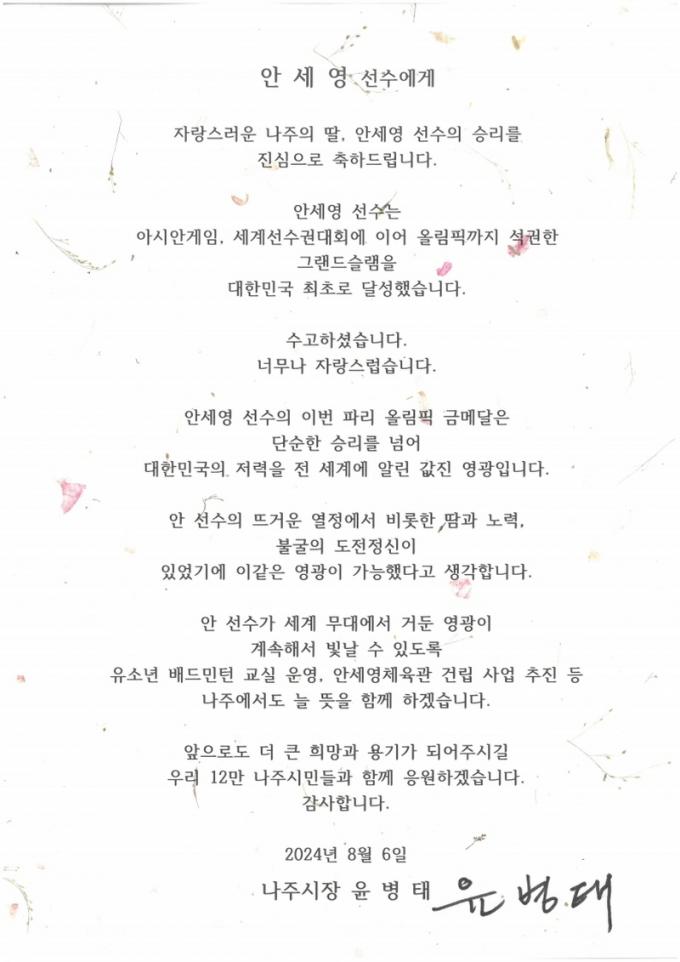 À±º´Å ½ÃÀåÀº ÃàÀüÀ» ÅëÇØ ¡°¾È¼¼¿µ ¼±¼öÀÇ À̹ø ÆÄ¸®¿Ã¸²ÇÈ ±Ý¸Þ´ÞÀº ´Ü¼øÇÑ ½Â¸®¸¦ ³Ñ¾î ´ëÇѹα¹ÀÇ Àú·ÂÀ» Àü ¼¼°è¿¡ ¾Ë¸° °ªÁø ¿µ±¤¡±À̶ó¸ç ÃàÇÏÀÇ ¶æÀ» ÀüÇß´Ù.¾Æ¿ï·¯ ¡°¾È ¼±¼ö°¡ ¼¼°è ¹«´ë¿¡¼ °ÅµÐ ¿µ±¤ÀÌ °è¼ÓÇØ¼ ºû³¯ ¼ö ÀÖµµ·Ï À¯¼Ò³â ¹èµå¹ÎÅÏ ±³½Ç ¿î¿µ, ¾È¼¼¿µ üÀ°°ü °Ç¸³ »ç¾÷ ÃßÁø µî ³ªÁÖ¿¡¼µµ ¶æÀ» ÇÔ²² Çϰڴ١±°í ÀüÇß´Ù.