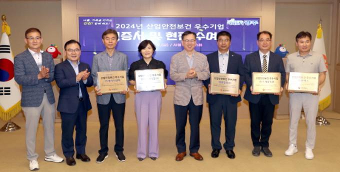 [È£³²´º½º¶óÀÎ = ¼ÀºÈ« ±âÀÚ] ±¤ÁÖ±¤¿ª½Ã(°±âÁ¤ ½ÃÀå)´Â 9ÀÏ ½Ãû ºñÁî´Ï½º·ë¿¡¼ ¡®2024³â ±¤Áֽà »ê¾÷¾ÈÀüº¸°Ç ¿ì¼ö±â¾÷¡¯ 5°³ »ç¿¡ ÀÎÁõ¼¿Í ÇöÆÇÀ» ¼ö¿©Çß´Ù.