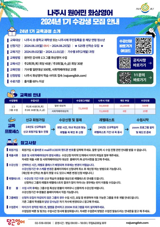 1±â ±³À°À» Èñ¸ÁÇÏ´Â ÇлýµéÀº ³ªÁֽà Ȼ󿵾î ȨÆäÀÌÁöwww.najuenglish.com)¿¡¼ ½ÅûÇÏ¸é µÈ´Ù. ±³À°½Ã°£Àº ÁÖ 2ȸ(È¡¤¸ñ) ȸ´ç 45ºÐ ¶Ç´Â ÁÖ 3ȸ(¿ù¡¤¼ö¡¤±Ý) ȸ´ç 30ºÐÀ¸·Î 1ÁÖÀÏ¿¡ 90ºÐ°£ ÁøÇàÇÑ´Ù. ¼ö¾÷ ½Ã°£Àº ¿ÀÈÄ 2~11½Ã »çÀÌ¿¡ ÀÚÀ¯·Ó°Ô ¼±ÅÃÇÒ ¼ö ÀÖ´Ù.