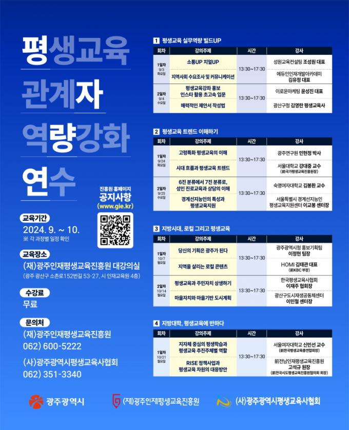 À̹ø ¿¬¼ö´Â ±¤ÁÖ½Ã¿Í ÁøÈï¿øÀÌ ÁÖÃÖÇϰí (»ç)±¤ÁÖ±¤¿ª½ÃÆò»ý±³À°»çÇùȸ ÁÖ°üÀ¸·Î ÁøÇàµÈ´Ù. Æò»ý±³À° ½Ç¹«¿ª·®ºÎÅÍ Æ®·»µå, ·ÎÄÃ, ´ëÇÐ Æò»ý±³À° µî ºÐ¾ßº° Àü¹®°¡¸¦ ÃʺùÇØ 4°³ °úÁ¤, ÃÑ 14Â÷½Ã ±³À°ÀÌ ¿î¿µµÉ ¿¹Á¤ÀÌ´Ù.