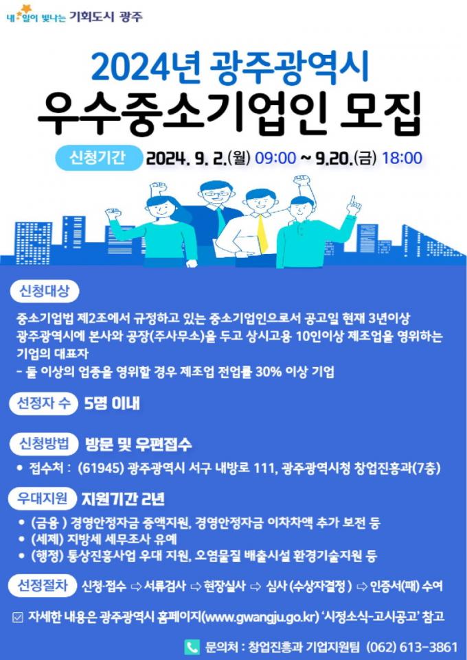½ÅûÀ» Èñ¸ÁÇÏ´Â ±â¾÷Àº 9¿ù 2ÀϺÎÅÍ 20ÀϱîÁö ±¤Áֽà â¾÷ÁøÈï°ú¿¡ ¹æ¹® ¶Ç´Â ¿ìÆíÀ¸·Î Á¢¼öÇÏ¸é µÈ´Ù. ÀÚ¼¼ÇÑ »çÇ×Àº ±¤Áֽà ´©¸®Áý(https://www.gwangju.go.kr) ½ÃÁ¤¼Ò½Ä, °í½Ã¡¤°ø°í¿¡ °ÔÀçµÈ °ø°í¹®À» Âü°íÇϰųª ±¤Áֽà â¾÷ÁøÈï°ú(062-613-3861)·Î ¹®ÀÇÇÏ¸é µÈ´Ù.