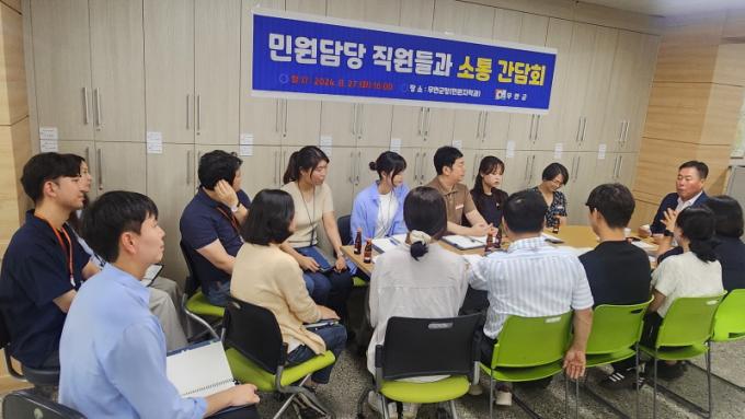 À̹ø °£´ãȸ´Â ÇàÁ¤ ÃÖÀϼ±¿¡¼ ¹Î¿ø ¼ºñ½º Çâ»ó°ú ±º¹Î ¸¸Á· ÇàÁ¤±¸ÇöÀ» À§ÇØ ³ë·ÂÇÏ´Â ¹Î¿ø½ÇÀ» Á÷Á¢ ¹æ¹®ÇÏ¿© Á÷¿øµéÀÇ ³ë°í¸¦ °Ý·ÁÇÏ¿´´Ù.