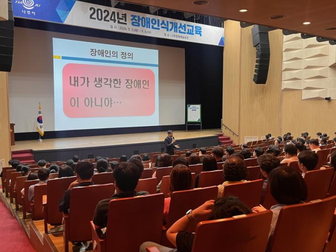 [È£³²´º½º¶óÀÎ = ¼ÀºÈ« ±âÀÚ] ³ªÁÖ½Ã(½ÃÀå À±º´ÅÂ)´Â Àüü Á÷¿øÀ» ´ë»óÀ¸·Î ÇÑ ¡®Àå¾ÖÀνݳ¼±±³À°¡¯À» ½Ç½ÃÇÏ¸é¼ ±³À° È¿°ú¸¦ ³ôÀ̱â À§ÇØ Àü¹®°»ç¸¦ ÃʺùÇØ ´ë¸é ¹æ½ÄÀ¸·Î ÁøÇàÇß´Ù°í ¹àÇû´Ù.