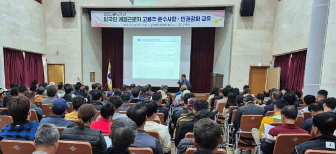 [È£³²´º½º¶óÀÎ = ¼ÀºÈ« ±âÀÚ] ³ªÁÖ½Ã(½ÃÀå À±º´ÅÂ)´Â Áö³´Þ 25ÀÏ ³ªÁֽóó¾÷±â¼ú¼¾ÅÍ¿¡¼ ¿Ü±¹ÀÎ °èÀý±Ù·ÎÀÚ °í¿ë³ó°¡ 200¸íÀ» ´ë»óÀ¸·Î °í¿ëÁÖ Áؼö»çÇ× ¹× ÀÎ±Ç°È ±³À°À» ½Ç½ÃÇß´Ù°í 1ÀÏ ¹àÇû´Ù.