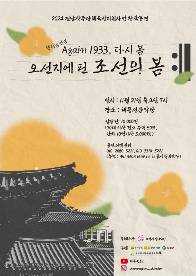 À̹ø °ø¿¬Àº 2024³â °ø¿¬Àå »óÁÖ´Üü À°¼ºÁö¿ø»ç¾÷ÀÇ ¸ñÀûÀ¸·Î Àü¶ó³²µµ ¹®ÈÀç´Ü°ú Àü¶ó³²µµ, º¸¼º±ºÀÇ ÈÄ¿ø ¾Æ·¡ ÁøÇàµÈ´Ù.