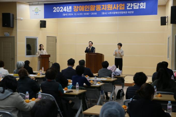 [È£³²´º½º¶óÀÎ = ¼ÀºÈ« ±âÀÚ] ³ªÁÖ½Ã(½ÃÀå À±º´ÅÂ)´Â Áö³ 4ÀÏ ³ªÁÖ½ÃÀå¾ÖÀο¬ÇÕȸ°ü¿¡¼ Àå¾ÖÀÎȰµ¿Áö¿ø»ç¾÷ °ü°èÀÚ¿Í È°µ¿Áö¿ø»ç 100¿© ¸íÀ» ´ë»óÀ¸·Î °£´ãȸ¸¦ °³ÃÖÇß´Ù°í 5ÀÏ ¹àÇû´Ù.