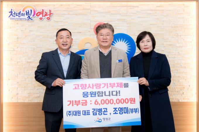 [È£³²´º½º¶óÀÎ = ¼ÀºÈ« ±âÀÚ] ÁÖ½Äȸ»ç ´ë¿ø ±èº´°ï, Á¶¿µ¹Ì ´ëÇ¥ ºÎºÎ°¡ Áö³ 11ÀÏ ¿µ±¤±ºÀ» ¹æ¹®ÇÏ¿© ÃÑ 6¹é¸¸¿ø(ºÎºÎ °¢ 3¹é¸¸¿ø)ÀÇ °íÇâ»ç¶û±âºÎ±ÝÀ» ±âŹÇß´Ù.