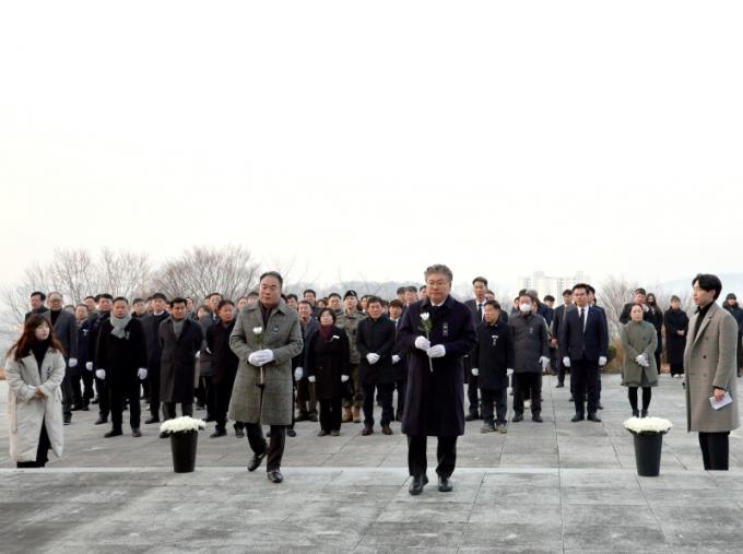 À̳¯ ÇöÃæÅ¾ Âü¹è´Â Àå¼¼ÀÏ ¿µ±¤±º¼ö¸¦ ºñ·ÔÇÑ ±è°Çå ¿µ±¤±ºÀÇȸÀÇÀå, µµÀÇ¿ø, ±ºÀÇ¿ø, ±â°ü¡¤»çȸ´ÜüÀå, °£ºÎ °ø¹«¿ø µî 80¿© ¸íÀÌ Âü¼®ÇÑ °¡¿îµ¥, ¼ø±¹¼±¿°ú È£±¹¿µ·ÉÀÇ ¶æÀ» ±â¸®¸ç Â÷ºÐÇÏ°í ¾ö¼÷ÇÑ ºÐÀ§±â ¼Ó¿¡¼ ÁøÇàµÇ¾ú´Ù.