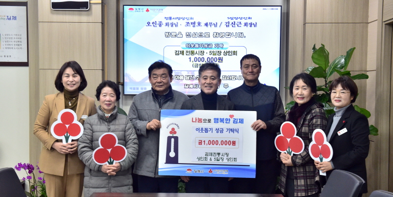 [호남뉴스라인 = 서은홍 기자] 김제시(시장 정성주)는 김제전통시장 상인회와 5일장 상인회가 7일 저소득 취약계층 등을 돕는 데 사용해달라며 각 상인회에서 50만원씩, 총 100만원을 후원했다고 밝혔다.