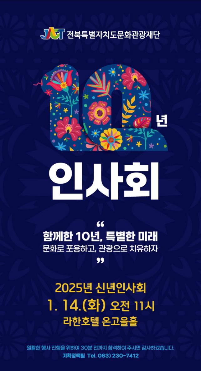 [È£³²´º½º¶óÀÎ = ¼ÀºÈ« ±âÀÚ] ÀüºÏƯº°ÀÚÄ¡µµ¹®È°ü±¤Àç´Ü(ÀÌÇÏ Àç´Ü, ´ëÇ¥ÀÌ»ç À̰æÀ±)ÀÌ ¿À´Â 14ÀÏ ¿ÀÀü 11½Ã, ¶óÇÑÈ£ÅÚ¿¡¼ ¡®2025³â ¹®È¿¹¼ú¡¤°ü±¤ ½Å³â Àλçȸ¡¯¸¦ °³ÃÖÇÑ´Ù. À̹ø Çà»ç´Â Àç´Ü ¼³¸³ 10ÁÖ³âÀ» ¸Â¾Æ ¡®ÇÔ²²ÇÑ 10³â, Ưº°ÇÑ ¹Ì·¡¡¯¶ó´Â ½½·Î°Ç ¾Æ·¡, ±×°£ÀÇ ¼º°ú¸¦ µ¹¾Æº¸°í ÇâÈÄ ºñÀüÀ» °øÀ¯ÇÏ´Â ÀÚ¸®·Î ¸¶·ÃµÆ´Ù.