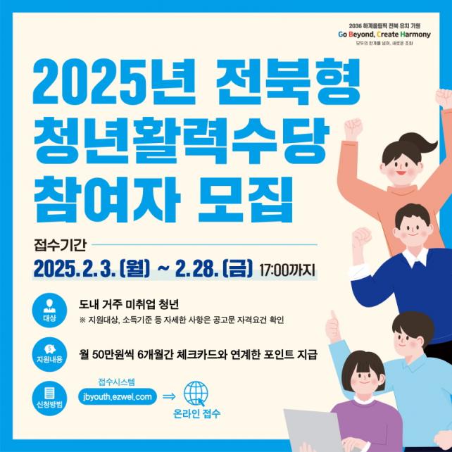 [È£³²´º½º¶óÀÎ = ¼ÀºÈ« ±âÀÚ] ÀüºÏƯº°ÀÚÄ¡µµ°¡ ¹ÌÃë¾÷ û³âµéÀÇ ±¸Á÷ ÀÇ¿åÀ» °íÃëÇÏ°í »çȸÁøÀÔÀ» µ½±â À§ÇØ ¿À´Â 2¿ù 3ÀϺÎÅÍ ¡®2025³â ÀüºÏÇü û³âȰ·Â¼ö´ç Áö¿ø»ç¾÷¡¯ Âü¿©ÀÚ¸¦ ¸ðÁýÇÑ´Ù°í ¹àÇû´Ù.