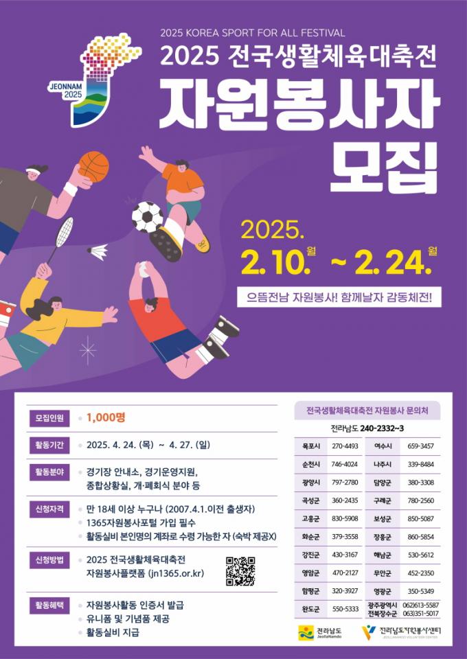 ÀÚ¿øºÀ»çÀÚ ¸ðÁý ±â°£Àº ¿À´Â 10ÀϺÎÅÍ 24ÀϱîÁö 15Àϰ£ÀÌ´Ù. Áö¿ø ÀÚ°ÝÀº 18¼¼ ÀÌ»ó ´©±¸³ª °¡´ÉÇϸç, ½ÅûÀº ¡®2025 Àü±¹»ýȰüÀ°´ëÃàÀü ÀÚ¿øºÀ»ç Ç÷§Æû(jn1365.or.kr)¡¯¿¡¼ ¿Â¶óÀÎÀ¸·Î Á¢¼öÇϰųª, °¢ °³ÃÖ ½Ã±º ÀÚ¿øºÀ»ç¼¾Å͸¦ ¹æ¹®ÇØ ½ÅûÇÒ ¼ö ÀÖ´Ù.