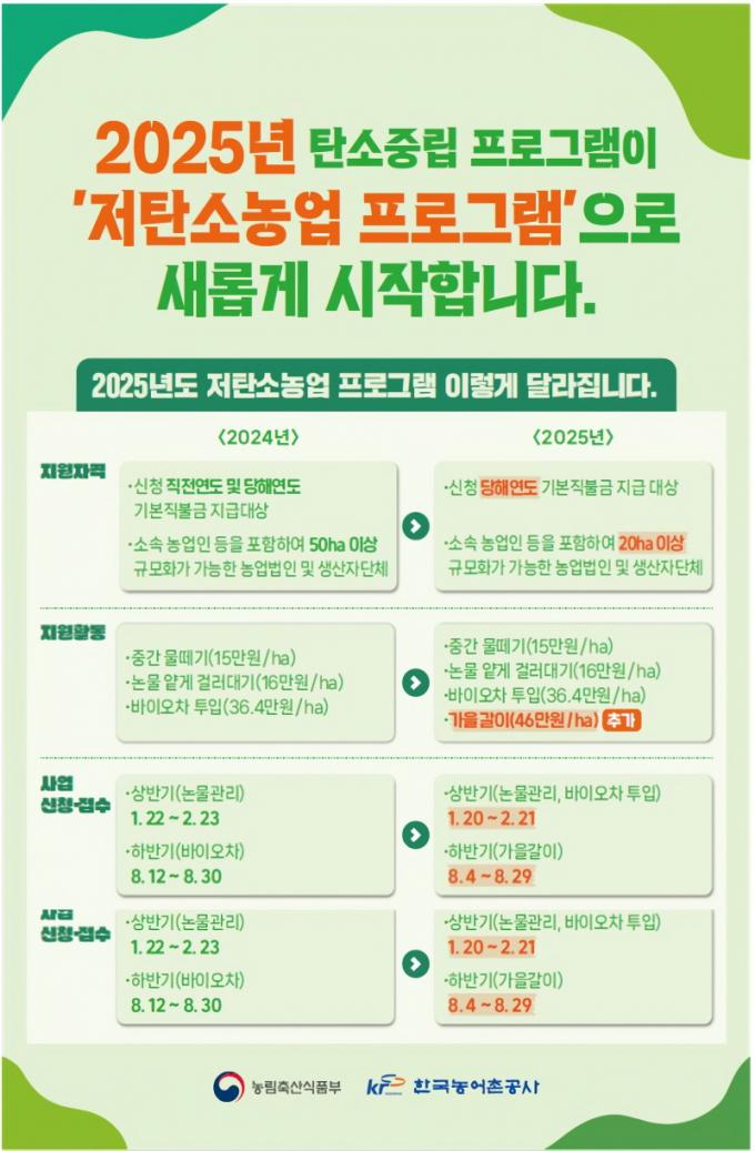 Àúź¼Ò³ó¾÷ ÇÁ·Î±×·¥Àº Áß°£ ¹°¶¼±â, ³í¹° ¾è°Ô °É·¯´ë±â, ¹ÙÀÌ¿ÀÂ÷ ÅõÀÔ µî Àúź¼Ò ¿µ³óȰµ¿À» ÇÑ ³ó°¡¿¡ Ȱµ¿ºñ¸¦ Áö¿øÇÏ´Â »ç¾÷ÀÌ´Ù. ¿ÃÇØºÎÅÍ °¡À»°¥À̰¡ Ãß°¡µÆ´Ù. °¡À»°¥ÀÌ È°µ¿Àº ÇϹݱ⿡ ½Åû¹ÞÀ» ¿¹Á¤ÀÌ´Ù.