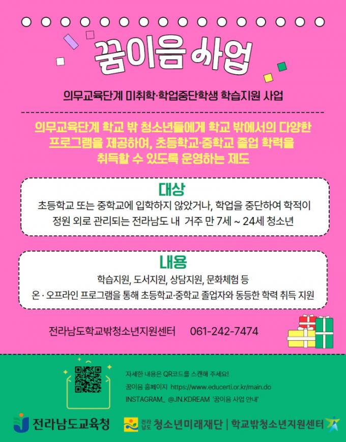 Àǹ«±³À°´Ü°èÀÎ ÃʵîÇб³, ÁßÇб³ °úÁ¤¿¡¼ ¹ÌÃëÇÐ ¶Ç´Â Çо÷Áß´Ü µîÀÇ ÀÌÀ¯·Î Çб³ ¹Û û¼Ò³âµéÀÌ Áö¼ÓÀûÀ¸·Î ¹ß»ýÇϰí ÀÖ´Ù. ÀÌ¿¡ ¡®²ÞÀÌÀ½¡¯¿¡¼´Â µµ³» Çб³ ¹Û û¼Ò³âÀ» ´ë»óÀ¸·Î ÇнÀÁö¿ø, µµ¼Áö¿ø, »ó´ãÁö¿ø µî ¿Â¡¤¿ÀÇÁ¶óÀÎ ÇÁ·Î±×·¥À» Á¦°øÇÑ´Ù.