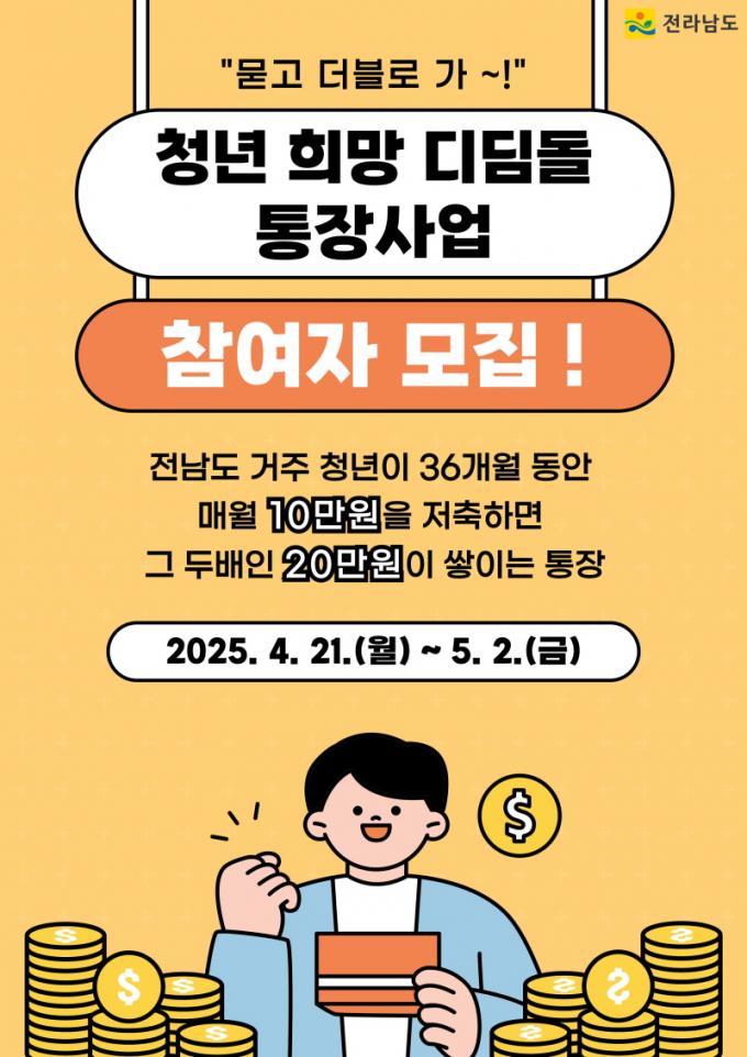 [È£³²´º½º¶óÀÎ = ¼ÀºÈ« ±âÀÚ] Àü¶ó³²µµ´Â ¿À´Â 5¿ù 2ÀϱîÁö ¡®2025³â û³â Èñ¸Áµðµõµ¹ ÅëÀ塯 »ç¾÷ÀÇ ½Å±Ô Âü¿©ÀÚ¸¦ ¸ðÁýÇϰí, Àû°Ý½É»ç¸¦ °ÅÃÄ 7¿ù ÃÑ 825¸íÀ» ÃÖÁ¾ ¼±Á¤ÇÒ °èȹÀ̶ó°í ¹àÇû´Ù.