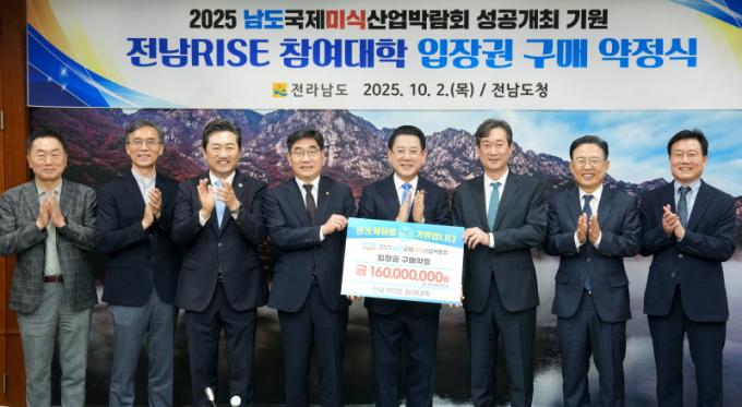 [È£³²´º½º¶óÀÎ = ¼ÀºÈ« ±âÀÚ] Àü¶ó³²µµ´Â 2ÀÏ µµÃ» Á¢°ß½Ç¿¡¼ Àü³²RISE Âü¿©´ëÇÐ ÃÑÀå´Ü°ú ÇÔ²² ¡®2025 ³²µµ±¹Á¦¹Ì½Ä»ê¾÷¹Ú¶÷ȸ ÀÔÀå±Ç ±¸¸Å ¾àÁ¤½Ä¡¯À» °³ÃÖÇß´Ù.