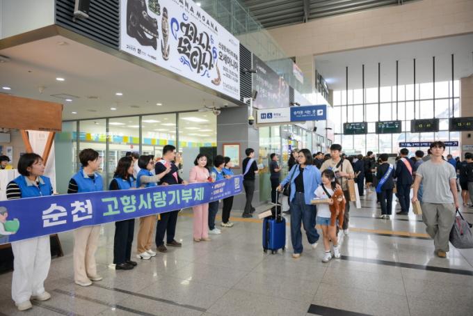 [È£³²´º½º¶óÀÎ = ¼ÀºÈ« ±âÀÚ] ¼øÃµ½Ã(½ÃÀå ³ë°ü±Ô)´Â 2ÀÏ ¼øÃµ¿ª ±¤Àå¿¡¼ Ãß¼®À» ¸Â¾Æ °íÇâÀ» ¹æ¹®ÇÏ´Â ±Í¼º°´°ú °ü±¤°´À» ´ë»óÀ¸·Î ȯ¿µ Çà»ç¿Í ½ÃÁ¤ È«º¸È°µ¿À» ÆîÃÆ´Ù.