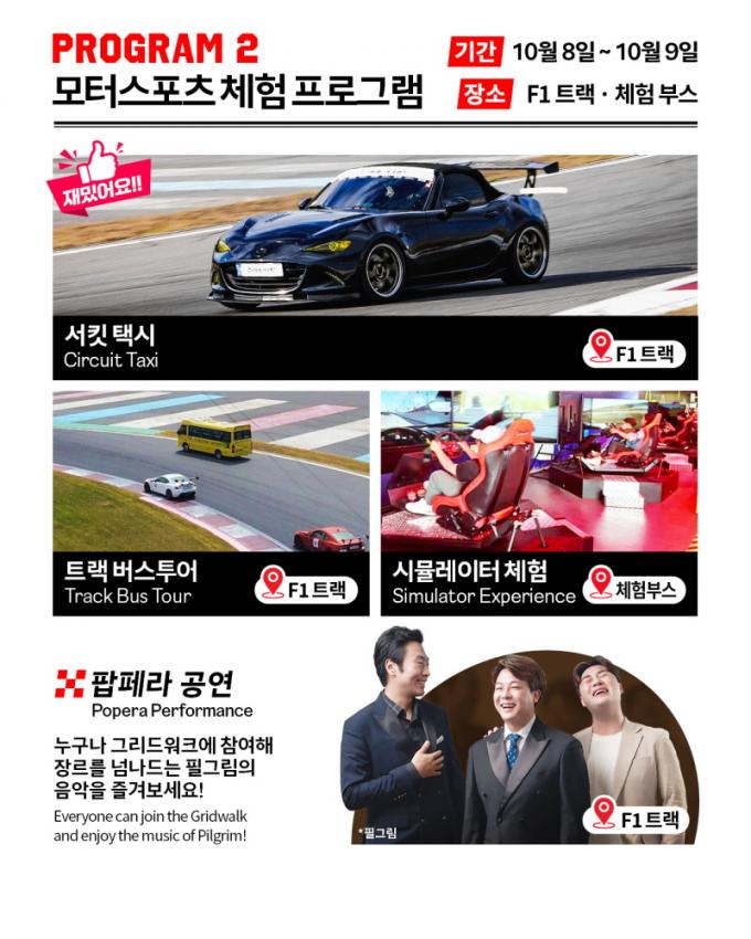 8~9ÀÏ¿¡´Â ¡®½ºÆ÷Ã÷Ä« µå¶óÀ̺ù 縰Áö¡¯¶ó´Â ÁÖÁ¦·Î Âü°¡Â÷·®ÀÌ F1Æ®·¢¸¦ ÁÖÇàÇϸç, ¹æ¹®°´Àº ½ºÆ÷Ã÷Ä« Â÷·®¿¡ µ¿½ÂÇÏ´Â ¡®¼Å¶ Åý᯷Π·¹À̽ÌÀ» °£Á¢ üÇèÇÒ ¼ö ÀÖ´Ù. Æ®·¢ Ãâ¹ß¼±¿¡ µµ¿µÈ Âü°¡Â÷·®°ú Æ÷ÅäŸÀÓÀ» Áñ±æ ¼ö ÀÖ´Â ±×¸®µå¿öÅ©°¡ ÀçÇöµÇ°í, ÆËÆä¶ó °¡¼ö °ø¿¬À» µ¿½Ã °ü¶÷ÇÏ´Â »ö´Ù¸¥ Çà»ç°¡ ÁøÇàµÈ´Ù.