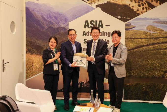 Áö³ 9ÀÏ ¾Æ¶ø¿¡¹Ì¸®Æ® ¾ÆºÎ´Ùºñ¿¡¼ ³ë°ü±Ô ¼øÃµ½ÃÀåÀÌ µòµµ įÇʶõ(Dindo Campilan) IUCN ¾Æ½Ã¾ÆÁö¿ªÃ¥ÀÓÀÚ¿Í ¾çÀÚȸ´ãÀ» °®°í ±â³ä»çÁøÀ» ÃÔ¿µÇϰí ÀÖ´Ù(¿ÞÂʺÎÅÍ Á¤¼±È Á¤ºÎÇù·Â°ü, µòµµ įÇʶõ IUCN ¾Æ½Ã¾ÆÁö¿ªÃ¥ÀÓÀÚ, ³ë°ü±Ô ¼øÃµ½ÃÀå, ȲÅÂÁÖ Àü·«±âȹ±¹Àå) |