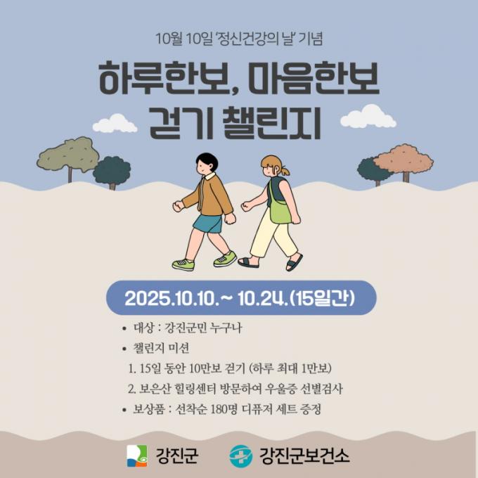 縰Áö´Â °Áø ±º¹Î ´©±¸³ª Âü¿©ÇÒ ¼ö ÀÖÀ¸¸ç, 15Àϰ£ 10¸¸º¸ °È±â(ÇÏ·ç ÃÖ´ë 1¸¸º¸) ¹× º¸Àº»ê Èú¸µ¼¾ÅÍ(°ÁøÀ¾ °í¼º±æ 162)¿¡ ¹æ¹®ÇØ ¿ì¿ïÁõ ¼±º°°Ë»ç¸¦ ½Ç½ÃÇÏ¸é µÈ´Ù. Âü¿©ÀÚ Áß Ã§¸°Áö¿¡ ¼º°øÇÑ ¼±Âø¼ø 180¸í¿¡°Ô´Â ¼ÒÁ¤ÀÇ ±â³äǰÀ» Á¦°øÇÒ ¿¹Á¤ÀÌ´Ù.