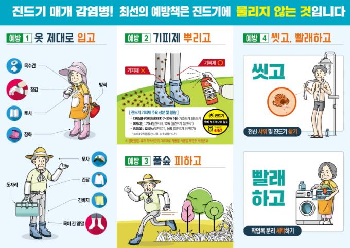 ¿¹¹æÀ» À§Çؼ´Â ³óÀÛ¾÷¡¤»ê³ª¹° äÃ롤ÅÔ¹ç °¡²Ù±â¡¤µî»ê µî ¾ß¿ÜȰµ¿ ½Ã Ç®¹ç¿¡ Á÷Á¢ ¾ÉÁö ¸»°í, ±äÆÈ°ú ±ä¹ÙÁö¸¦ Âø¿ëÇØ ÇǺΠ³ëÃâÀ» ÃÖ¼ÒÈÇØ¾ß ÇÑ´Ù. ¶ÇÇÑ Áøµå±â ±âÇÇÁ¦¸¦ »ç¿ëÇϰí, ¾ß¿ÜȰµ¿ ÈÄ¿¡´Â ÀÔÀº ¿ÊÀ» ¼¼Å¹ÇÏ°í ¹Ù·Î »þ¿öÇÏ´Â °ÍÀÌ ÁÁ´Ù.