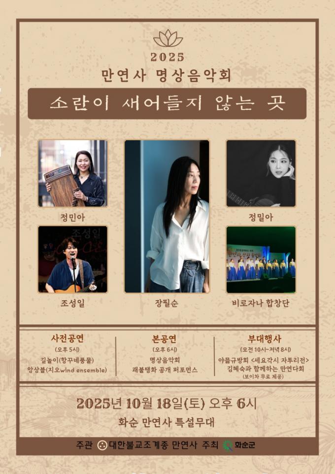 ȼø±ºÀÌ ÁÖÃÖÇÏ°í ¸¸¿¬»ç°¡ ÁÖ°üÇÏ´Â À̹ø »ê»çÀ½¾Çȸ´Â 1208³â ¼³¸³µÈ õ³â°íÂû ¸¸¿¬»çÀÇ ¿îÄ¡ Àִ dz°æÀ» ¹è°æ »ï¾Æ ¡®¼Ò¶õÀÌ »õ¾îµéÁö ¾Ê´Â °÷¡¯À̶õ ÁÖÁ¦ÀÇ ¸í»óÀ½¾Çȸ¸¦ ÅëÇØ ¸¶À½ÀÚ¸®¸¦ µé¿©´Ùº¸´Â ½Ã°£À¸·Î ±âȹµÇ¾ú´Ù.