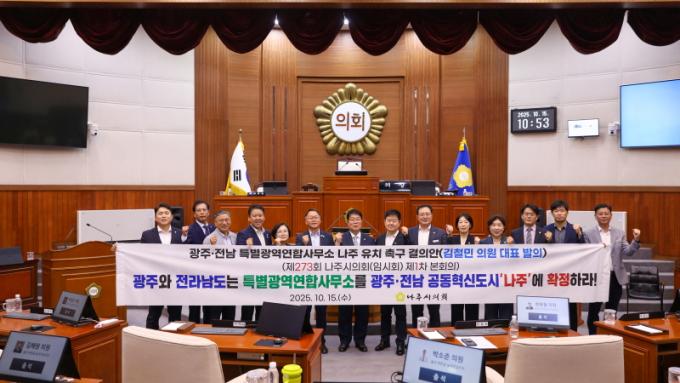 ³ªÁÖ½ÃÀÇȸ´Â À̹ø °ÇÀǾÈÀ» ÅëÇØ ¡ã±¤ÁÖ¡¤Àü³² Ưº°±¤¿ª¿¬ÇÕ ±Ô¾à¿¡ »ç¹«¼Ò ¼ÒÀçÁö¸¦ ¸í½ÃÀûÀ¸·Î ±¤ÁÖ¡¤Àü³² °øµ¿Çõ½Åµµ½Ã(³ªÁֽà ºû°¡¶÷µ¿)À¸·Î È®Á¤ÇÒ °Í°ú ¡ãÈļÓÇùÀÇ Àü °úÁ¤¿¡¼ »ó¡¼º¡¤Á¤ÇÕ¼º¡¤°Å¹ö³Í½º Á¢±Ù¼ºÀ» °¡»ê¿ä¼Ò·Î ¸í¹®ÈÇϰí, ´Ù¸¥ Çö¾È°úÀÇ Á¤Ä¡Àû ±³È¯¡¤°Å·¡¸¦ ÀÏü ¹èÁ¦ÇÒ °Í, ¡ãÁ¤ºÎ¡¤±¤Áֽá¤Àü³²µµ´Â ³ªÁÖ À¯Ä¡¿¡ ÇÊ¿äÇÑ ÀÎÇÁ¶ó¿Í ¿¹»êÀ» Á¶¼ÓÈ÷ È®Á¤Çϰí, ¿¬ÇÕ Ãâ¹ü ÀÏÁ¤°ú ¿¬µ¿ÇØ ÇàÁ¤ °ø¹é ¾øÀÌ ÁýÇà °èȹÀ» Á¦½ÃÇÒ °ÍÀ» Ã˱¸Çß´Ù.