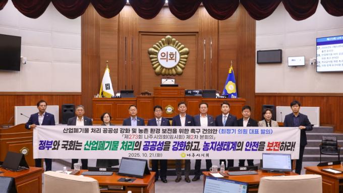 [È£³²´º½º¶óÀÎ = ¼ÀºÈ« ±âÀÚ] ³ªÁÖ½ÃÀÇȸ(ÀÇÀå ÀÌÀç³²)´Â 21ÀÏ Á¦273ȸ ÀÓ½Ãȸ Á¦2Â÷ º»È¸ÀǸ¦ ¿°í ¡®»ê¾÷Æó±â¹° ó¸® °ø°ø¼º °È ¹× ³óÃÌ È¯°æ º¸ÀüÀ» À§ÇÑ Ã˱¸ °ÇÀǾȡ¯À» äÅÃÇß´Ù.