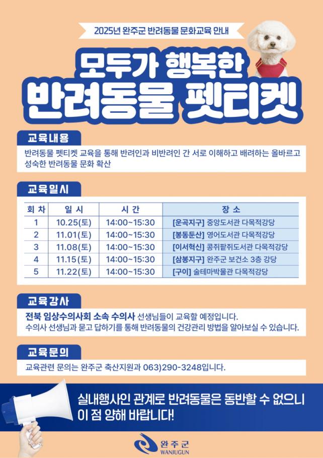 À̹ø ±³À°Àº ¹Ý·ÁÀΰú ºñ¹Ý·ÁÀÎÀÌ ÇÔ²² ¾î¿ï¸®´Â °Ç°ÇÑ ¹Ý·Á¹®È Á¶¼ºÀ» ¸ñÇ¥·Î, ¿ÏÁÖ±º ³» Àα¸¹ÐÁý Áö¿ªÀ» Áß½ÉÀ¸·Î ¼øÈ¸ ÁøÇàµÈ´Ù. ±³À°Àº ¿À´Â 25ÀÏ ¿ëÁøÀ¾ ¿î°îÁö±¸¸¦ ½ÃÀÛÀ¸·Î ºÀµ¿ µÐ»ê, À̼ Çõ½Å, »ïºÀÁö±¸¸¦ °ÅÃÄ ¸¶Áö¸·À¸·Î 11¿ù 22ÀÏ ±¸ÀÌ È£¼ö¸¶À»±îÁö ÃÑ 5ȸ¿¡ °ÉÃÄ ¿î¿µµÉ ¿¹Á¤ÀÌ´Ù.