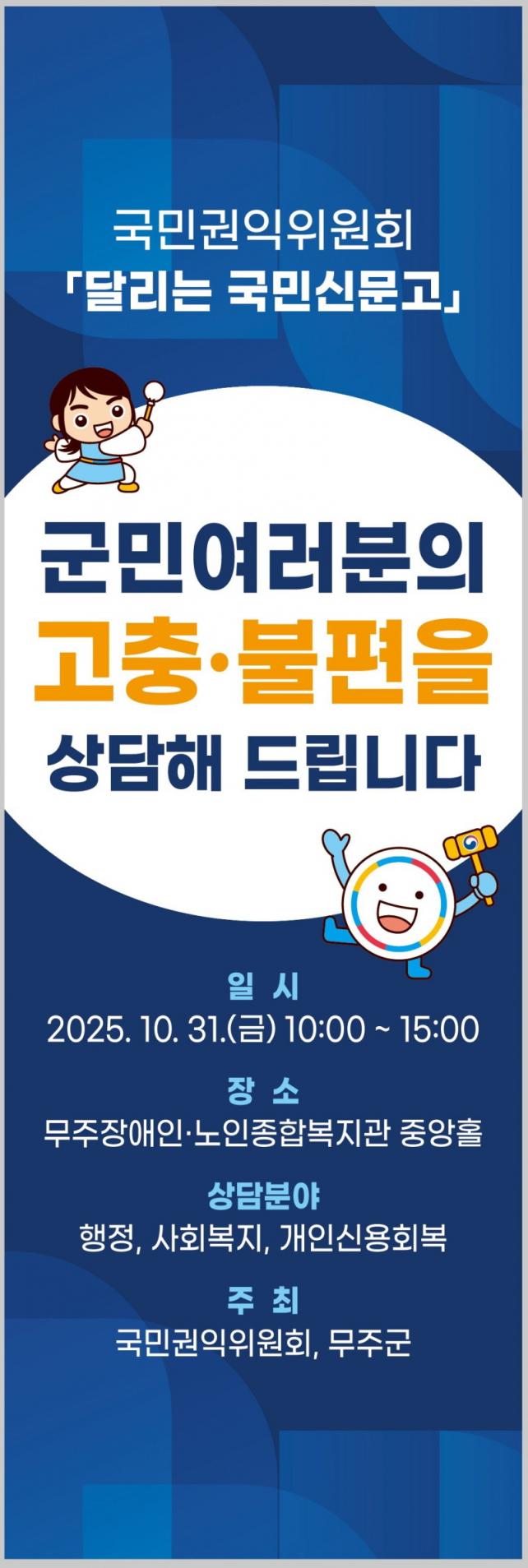 ´çÀÏ ¿ÀÀü 10½ÃºÎÅÍ ¿ÀÈÄ 3½Ã±îÁö ±¹¹Î±ÇÀÍÀ§¿øÈ¸ Á¶»ç°ü°ú Çѱ¹»çȸº¹ÁöÇùÀÇȸ, ½Å¿ëȸº¹À§¿øÈ¸ µî Çù¾÷ ±â°üÀÇ Àü¹® »ó´ã ÀηÂÀÌ ¹«ÁÖÀ¾ ¼ÒÀç ¹«ÁÖ»ó»ó¹Ýµð½£ ´Ù¸ñÀû½Ç¿¡¼ ¹«ÁÖ±º¹Îµé°ú ¸¸³¯ ¿¹Á¤ÀÌ´Ù.