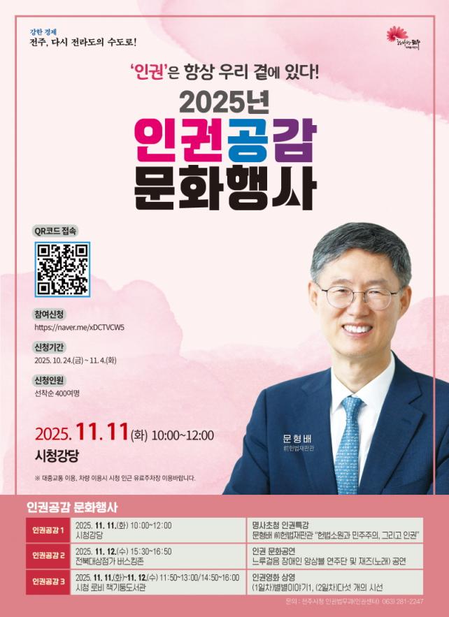 ¡®ÀαÇÀº Ç×»ó ¿ì¸® °ç¿¡ ÀÖ´Ù!¡¯¸¦ ÁÖÁ¦·Î ÇÑ À̹ø Çà»ç´Â ÀüÁÖ½Ãû °´ç°ú ÀüºÏ´ë»óÁ¡°¡ ¹ö½ºÅ·Á¸, ½Ãû ·Îºñ Ã¥±âµÕµµ¼°ü µî¿¡¼ ÁøÇàµÇ¸ç, ¡âÀÎ±Ç Æ¯° ¡â¹®È°ø¿¬ ¡âÀαǿµÈ »ó¿µ ¡âÈ«º¸ºÎ½º ¿î¿µ µî ½Ã¹ÎÀÌ Àϻ󿡼 ÀαÇÀÇ °¡Ä¡¸¦ ü°¨ÇÒ ¼ö ÀÖ´Â ´Ù¾çÇÑ ÇÁ·Î±×·¥À¸·Î ±¸¼ºµÈ´Ù.