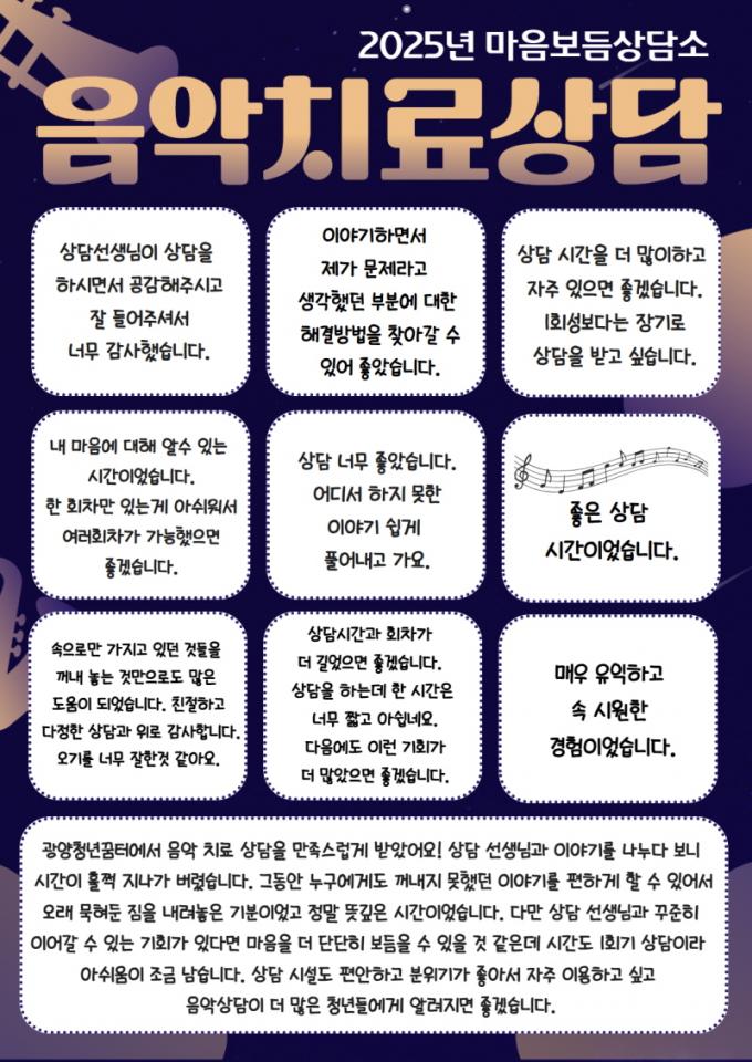 À½¾ÇÄ¡·á»ó´ã¿¡ Âü¿©ÇÑ ¶Ç ´Ù¸¥ û³âÀº ¡°À½¾ÇÀ» ÅëÇØ °¨Á¤À» ÀÚ¿¬½º·´°Ô Ç¥ÇöÇÒ ¼ö ÀÖ¾ú°í, »ó´ã»ç¿ÍÀÇ ´ëȸ¦ ÅëÇØ ¸¶À½ÀÌ ÇÑ°á °¡º¿öÁ³´Ù¡±¸ç ¡°½º½º·Î¸¦ À§·ÎÇÒ ¼ö ÀÖ´Â µû¶æÇÑ ½Ã°£À̾ú´Ù¡±°í ÀüÇß´Ù.