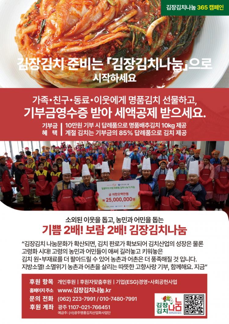 ÇÑÆí, ¸íǰ±¤ÁÖ±èÄ¡(ÁÖ)ÀÇ ¸ð¹ýÀÎ (»ç)±¤ÁÖ¸íǰ±èÄ¡»ê¾÷È»ç¾÷´ÜÀº 2011³â ¼³¸³ ÀÌÈÄ ±¤ÁÖ¼¼°è±èÄ¡ÃàÁ¦ ¹× »ç¶û³ª´® ±èÀå´ëÀüÀÇ »ç¹«±¹ ¿ªÇÒ µîÀ¸·Î Ȱµ¿ÇØ¿ÔÀ¸¸ç, 2024³â ±âȹÀçÁ¤ºÎ °øÀ͹ýÀÎÀ¸·Î ÁöÁ¤, 2025³â¿¡´Â °ø½Ä ±âºÎ±Ýǰ ¸ðÁý´Üü·Î µî·ÏµÇ¾úÀ¸¸ç, ¿Â¶óÀÎ www.±èÀå±èÄ¡³ª´®.kr ȨÆäÀÌÁö¸¦ °³¼³ÇÏ¿©, ±èÀå±èÄ¡³ª´® 365Ä·ÆäÀÎÀ» ÅëÇØ, ±èÀå±èÄ¡ ³ª´®À» ÅëÇÑ ±èÄ¡ ¼ÒºñÃËÁøÀ¸·Î ¼Ò¸êÀ§±âÁö¿ª ³ó¾îÃÌÀÇ ³ó¼ö»ê¹°À» ¿ì¼± ±¸¸ÅÇÏ¿© ±èÄ¡¸¦ »ý»êÇÏ´Â µî ÆÇ·Î È®º¸¸¦ ÅëÇÑ ¼ÒµæÁõ´ë ±â¿© µî Áö¿ª°æÁ¦ Ȱ¼ºÈ¿¡ ±â¿©Çϰí ÀÖ´Ù.