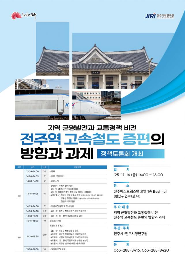 ÀüÁÖ½Ã¿Í ÀüÁÖ½ÃÁ¤¿¬±¸¿øÀº ¿À´Â 11¿ù 14ÀÏ ¿ÀÈÄ 2½Ã, º£½ºÆ®¿þ½ºÅÏÇ÷¯½º ÀüÁÖÈ£ÅÚ 1Ãþ º£½ºÆ®È¦(¿Ï»ê±¸ Çö¹«1±æ 41)¿¡¼ ¡®Áö¿ª ±ÕÇü¹ßÀü°ú ±³ÅëÁ¤Ã¥ ºñÀü-ÀüÁÖ¿ª °í¼Óöµµ ÁõÆí ¹æÇâ°ú °úÁ¦¡¯¸¦ ÁÖÁ¦·Î Á¤Ã¥Åä·Ðȸ¸¦ °³ÃÖÇÑ´Ù.