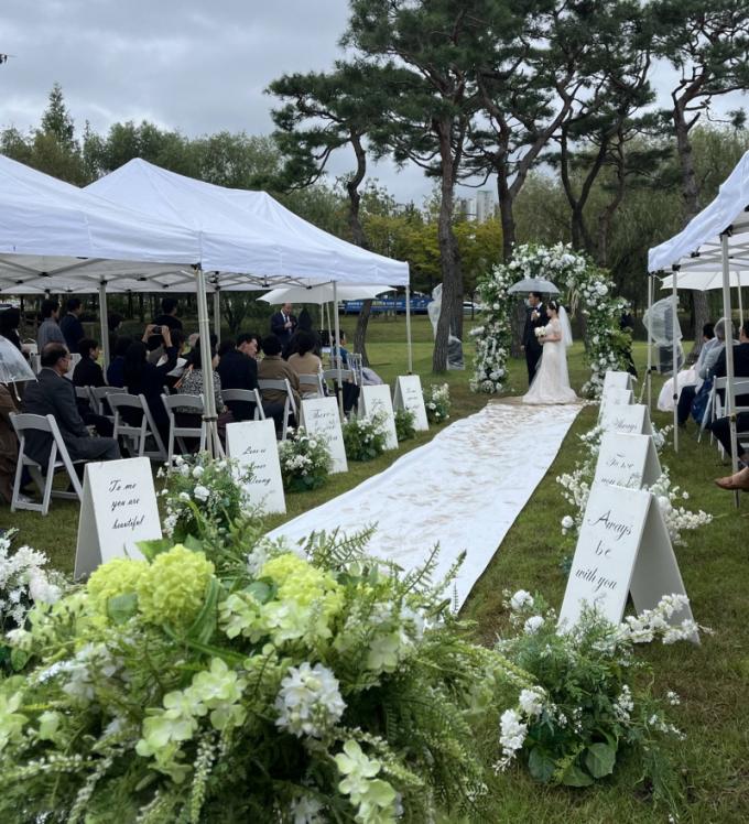 ºû°¡¶÷È£¼ö°ø¿ø¿¡¼ ¿¸° 2È£ Ä¿ÇÃÀÇ ¿¹½ÄÀº °¡À»ºñ ¼Ó¿¡¼µµ ¿µÈ ¡®¾î¹Ù¿ôŸÀÓ¡¯À» ¶°¿Ã¸®°Ô ÇÏ´Â µû¶æÇÑ ºÐÀ§±â ¼Ó¿¡ ÁøÇàµÆ´Ù. ºñ°¡ ³»¸®´Â ³¯¾¾¿¡µµ ¿ôÀ½ÀÌ ²÷ÀÌÁö ¾Ê¾Ò°í Çϰ´µéÀº ¡°ºñ±îÁö ÃູÀÌ µÈ ³¶¸¸ÀûÀÎ °áÈ¥½ÄÀ̾ú´Ù¡±¸ç °¨µ¿ÀÇ ¼Ò°¨À» ÀüÇß´Ù.
