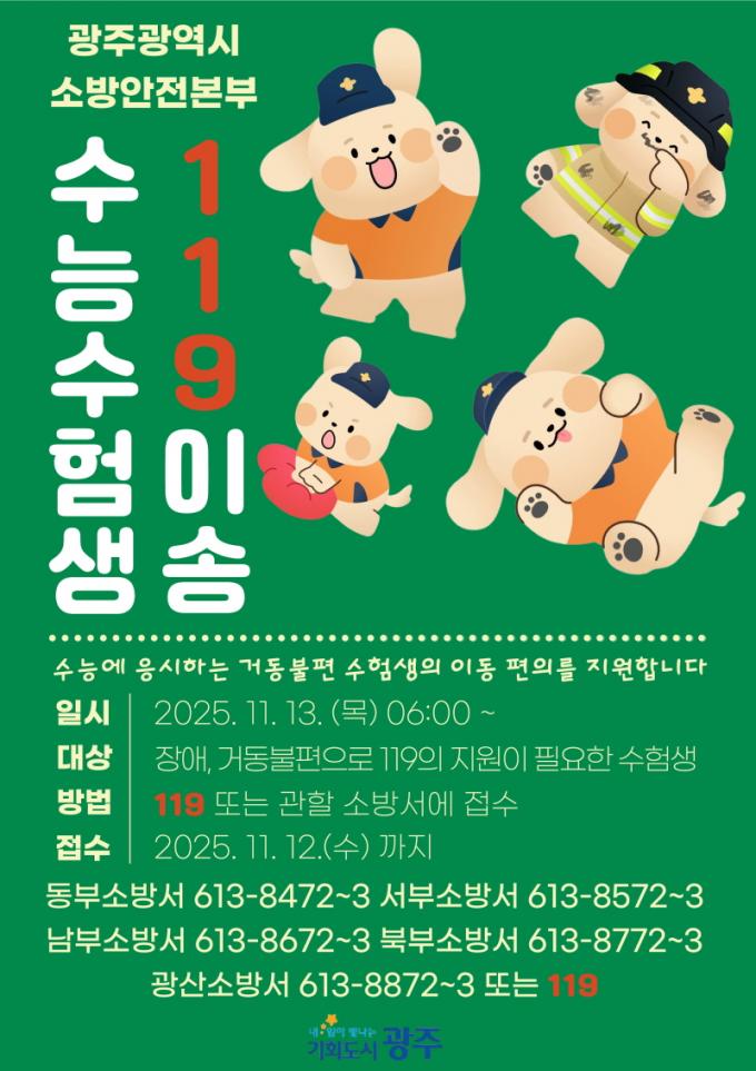 [È£³²´º½º¶óÀÎ = ¼ÀºÈ« ±âÀÚ] ±¤ÁÖ±¤¿ª½Ã ¼Ò¹æ¾ÈÀüº»ºÎ´Â ´ëÇмöÇдɷ½ÃÇèÀÏÀÎ 11¿ù13ÀÏ °Åµ¿ÀÌ ºÒÆíÇÑ ¼öÇè»ýµéÀÇ À̵¿ ÆíÀǸ¦ À§ÇØ ¡®119 À̼ÛÁö¿ø ¼ºñ½º¡¯¸¦ Á¦°øÇÑ´Ù.