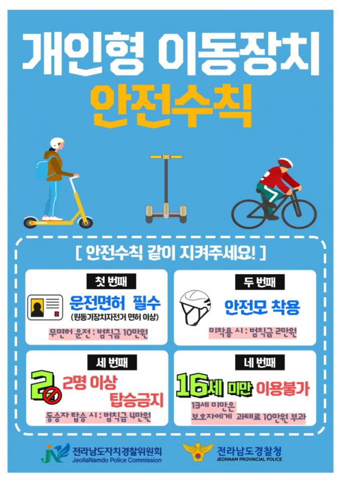 [È£³²´º½º¶óÀÎ = ¼ÀºÈ« ±âÀÚ] Àü¶ó³²µµÀÚÄ¡°æÂûÀ§¿øÈ¸(À§¿øÀå Á¤¼ø°ü)¿Í Àü³²°æÂûûÀº Ãֱ٠û¼Ò³âÀÇ °³ÀÎÇü À̵¿ÀåÄ¡ ¹«¸éÇã ¿îÀüÀÌ ±ÞÁõÇÔ¿¡ µû¶ó, ¸éÇã È®ÀÎ ÀýÂ÷¸¦ ¼ÒȦÈ÷ ÇÑ ´ë¿©¾÷ü¸¦ Çü¹ý»ó ¡®¹«¸éÇã ¹æÁ¶ÇàÀ§¡¯·Î Àû±Ø ´Ü¼ÓŰ·Î Çß´Ù.