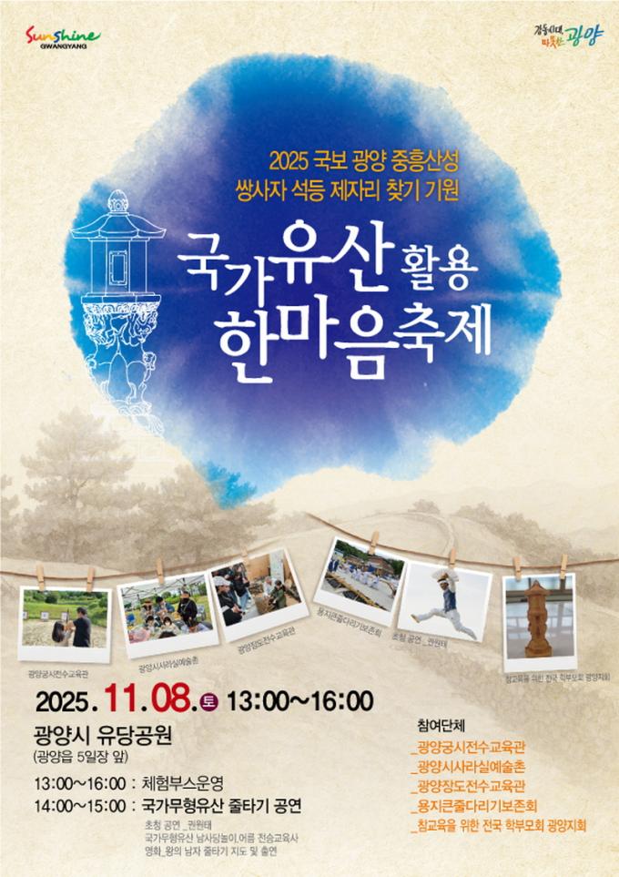 ±è¸í´ö ¹®È¿¹¼ú°úÀåÀº ¡°À̹ø ±¹°¡À¯»ê Ȱ¿ë ÇѸ¶À½ ÃàÁ¦´Â ½Ã¹Î°ú ÇÔ²² ±¤¾çÀÇ ±¹°¡À¯»êÀÌ Áö´Ñ °¡Ä¡¸¦ µÇ»õ±â°í, ½Ö»çÀÚ ¼®µî Á¦ÀÚ¸® ã±âÀÇ Àǹ̸¦ °øÀ¯ÇÏ´Â ¶æ±íÀº ÀÚ¸®¡±¶ó¸ç ¡°¾ÕÀ¸·Îµµ Áö¿ªÀÇ ¹®ÈÀ¯»êÀ» Ȱ¿ëÇÑ ´Ù¾çÇÑ ÇÁ·Î±×·¥À» ÅëÇØ ±¤¾çÀÇ ¿ª»ç¿Í ¹®È¸¦ ³Î¸® ¾Ë¸®°Ú´Ù¡±°í ¸»Çß´Ù.