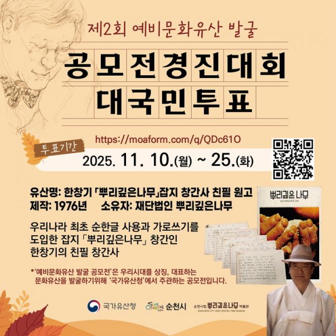 ¿¹ºñ¹®ÈÀ¯»ê È帷Π¿À¸¥ Ä£ÇÊ¿ø°í´Â ÀÌ·¯ÇÑ Çõ½ÅÀûÀÎ ÀâÁö¸¦ ¹ßÇàÇÑ ÍºÇÑâ±â ¼±»ýÀÌ µ¶Àڵ鿡°Ô ÀüÇϰíÀÚ Çß´ø ±íÀº °í¹Î°ú öÇÐÀÌ °í½º¶õÈ÷ ´ã±ä ±ÍÁßÇÑ ÀÚ·á·Î Æò°¡¹Þ´Â´Ù. ÃÖÁ¾ ¿¹ºñ¹®ÈÀ¯»ê ¼±Á¤Àº ´ë±¹¹Î ÅõÇ¥ °á°ú¸¦ ¹Ý¿µÇØ ÇöÀåÁ¶»ç¸¦ °ÅÄ£ ÈÄ 12¿ù¿¡ ¹ßÇ¥µÉ ¿¹Á¤ÀÌ´Ù. ´ë±¹¹Î ÅõÇ¥´Â 11¿ù 10ÀϺÎÅÍ 25ÀϱîÁö ¿Â¶óÀÎ(https://moaform.com/q/QDc61O)À» ÅëÇØ ÁøÇàµÈ´Ù.